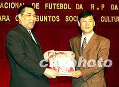 ![]() 澳門(mén)社會(huì)文化司司長(zhǎng)崔世安24日在澳門(mén)萬(wàn)豪軒酒樓為中國(guó)足球隊(duì)舉行歡迎午宴時(shí),向中國(guó)代表團(tuán)團(tuán)長(zhǎng)南勇贈(zèng)送禮品。中新社記者 李剛 攝