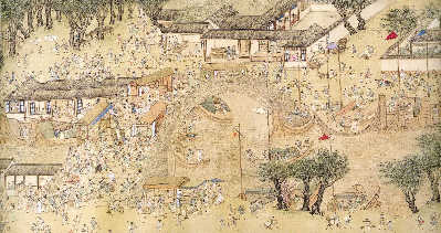 仇英的《清明上河圖》比宋本要長一倍,達(dá)到9.87米,以明代蘇州城為背景,采用青綠重設(shè)色方式,畫中人物超過2000位,描繪明代江南社會(huì)的城鄉(xiāng)人民生活實(shí)景,表現(xiàn)了熱鬧紛擾的市井生活和民俗風(fēng)情,場面宏大,氣勢雄偉。唐末孫位的《高逸圖》(又名《竹林七賢圖》)中的畫名“孫位高逸圖”為宋徽宗趙佶所題,它所描繪的是魏晉時(shí)期膾炙人口的竹林七賢的故事。畫家通過嫻熟高超的技術(shù),出色刻畫了魏晉士大夫的精神氣質(zhì)。