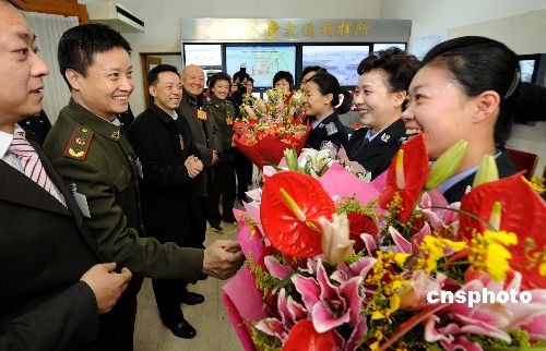 3月8日,國際婦女節(jié),出席十一屆全國政協(xié)會(huì)議的部分文藝界政協(xié)委員來到北京人民大會(huì)堂交通指揮所,向?yàn)閮蓵?huì)服務(wù)的女交警們獻(xiàn)上鮮花,表達(dá)節(jié)日的祝賀。中新社發(fā) 劉英毅 攝