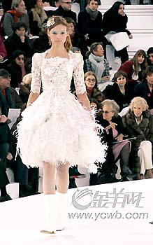 該品牌的高級定制服,向來就偏重經(jīng)典的傳統(tǒng)風格,掌門人KarlLagerfeld沿襲了香奈兒女士穿著設計的靈感,白色平底靴,斜呢紋套裝還有白色透明褶皺硬紗翻領,皆有可尋。