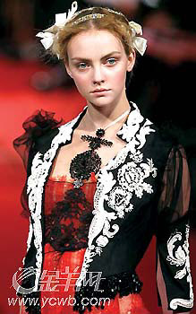 ChristianLacroix的時裝以設計復雜多變、風格瑰麗多彩見稱,他在這一季的高級定制女裝展中,最搶眼的是一襲如夢似幻的象牙色的雪紡紗短裙,紗裙上有精致的刺繡花朵,不論是用料和細節(jié)處理都極為細致,美麗得令人屏息!敖稹笔亲钅荛W耀奢華的色調(diào),更被ChristianLacroix于今季帶有濃郁宮廷色彩的系列中大量運用:鑲滿珠寶鉆飾的包款鞋,層疊在衣領、袖口或是裙擺的蕾絲荷葉邊,當然還有各式各樣富麗貴氣的頭飾。配合瑰麗的設計風格,充分表現(xiàn)出法國式的艷麗。