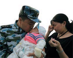 碼頭上滿是歡送的人群,其中最引人注目的是官兵的妻子們。這是一群偉大的女性,大家都親切地叫她們“礁嫂”。她們既有自己的工作,又要在分居的日子里獨自操持家務(wù),孝敬老人,撫育孩子,還要為守衛(wèi)孤礁的丈夫擔(dān)驚受怕。昨天下午,我們同幾名“礁嫂”座談,說起自己的丈夫和家庭,她們一會兒哭,一會兒笑,一會兒令人心酸,一會兒讓人開懷,以致所有記者都對她們肅然起敬。今天,這些“礁嫂”一遍又一遍地?fù)崦碇煞蛐厍暗拇蠹t花,情不自禁地淚流滿面。