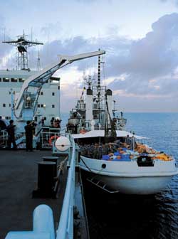 從清晨5時起,為永暑礁補給物資的工作就開始了。先是一艘拖船靠上我們的補給艦,然后補給艦上的吊車把各種物資一一吊裝到拖船上,甲板上一片忙碌。