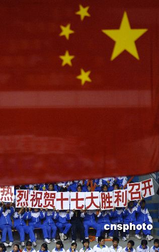 10月20日,2007-2008年全國(guó)男排聯(lián)賽的江蘇與上海男排比賽在江蘇省淮安體育館舉行,觀眾中的這幾位中學(xué)生打出了祝賀中國(guó)共產(chǎn)黨第十七大勝利召開(kāi)的標(biāo)語(yǔ)。中新社發(fā) 淮安曹政 攝