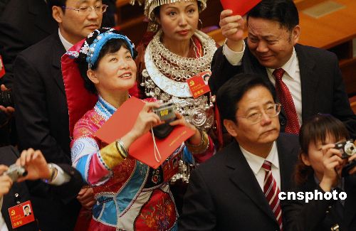 中國共產(chǎn)黨第十七次全國代表大會10月21日上午在北京人民大會堂閉幕,退場的貴州代表團(tuán)代表與在大會堂二樓的記者相互拍照。中新社發(fā) 任晨鳴 攝