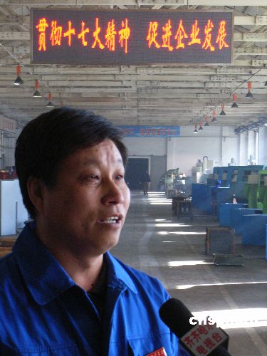 10月22日,齊齊哈爾建華公司黨委書(shū)記在接受采訪。當(dāng)日,中國(guó)共產(chǎn)黨第十七屆中央委員會(huì)第一次全體會(huì)議勝利閉幕。國(guó)家老工業(yè)基地齊齊哈爾市的產(chǎn)業(yè)工人非常高興,中國(guó)兵器工業(yè)集團(tuán)公司齊齊哈爾建華公司黨委書(shū)記谷云龍代表全體員工表示:堅(jiān)決擁護(hù)十七大的各項(xiàng)決議,擁護(hù)新一屆中央領(lǐng)導(dǎo)集體,緊密地團(tuán)結(jié)在黨中央周?chē),不斷增?qiáng)自主創(chuàng)新能力,為國(guó)家發(fā)展,社會(huì)和諧人民進(jìn)步多做貢獻(xiàn)。中新社發(fā) 王云龍 攝