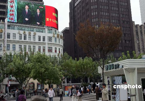 十月二十二日,上海南京路一個(gè)電子大屏幕直播北京人民大會(huì)堂新一屆中央政治局常委與中外記者見(jiàn)面實(shí)況,吸引上海市民駐足觀看。中新社發(fā) 潘索菲 攝