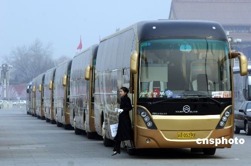 2008年3月8日,停在北京天安門廣場、全國政協(xié)十一次會議會場外的環(huán)保節(jié)能大巴。據(jù)悉,這種平均百公里油耗不到5升的環(huán)保大巴是首汽首次為“兩會”代表團(tuán)提供服務(wù)。此外,為營造奧運(yùn)年氣氛,“兩會”服務(wù)車的內(nèi)前擋風(fēng)玻璃下方都擺放了北京奧運(yùn)會吉祥物福娃。中新社發(fā) 張朋 攝