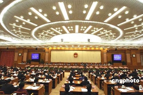 第十一屆全國人民代表大會常務(wù)委員會第一次會議3月19日上午在北京人民大會堂舉行,會議通過任命王萬賓、喬曉陽、張少琴、曹衛(wèi)洲、王慶喜、李連寧、何曄暉(女)、孫偉、劉振偉為全國人民代表大會常務(wù)委員會副秘書長,吳邦國委員長發(fā)表講話。中新社發(fā) 任晨鳴 攝