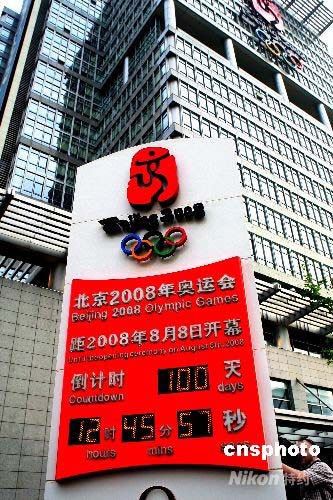 4月30日上午,顯示距北京2008年奧運會100天的北京奧運大廈倒計時牌吸引記者拍攝。當日京城隆重舉行系祝活動,表達京城各界人士盼望北京奧運會的喜悅心情。 中新社發(fā) 宋吉河 攝