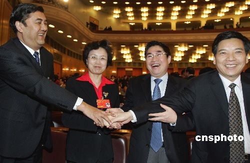 3月8日下午,十一屆全國人大一次會(huì)議在北京人民大會(huì)堂舉行第二次全體會(huì)議。當(dāng)日是“三八”國際婦女節(jié),大會(huì)開始前,在身材魁偉的新疆自治區(qū)主席努爾·白克力(左一)提議下,陜西省省長袁純清(右二)、云南省省長秦光榮(右一),共同祝賀青海省女省長宋秀巖節(jié)日快樂。中新社發(fā) 任晨鳴 攝