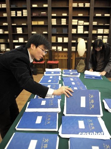 全國政協(xié)十一屆一次會(huì)議委員提案接收工作于三月九日下午兩點(diǎn)截止,據(jù)統(tǒng)計(jì),共收到委員提案4772件。圖為大會(huì)提案組辦公室工作人員在清點(diǎn)提案。中新社發(fā) 廖攀 攝
