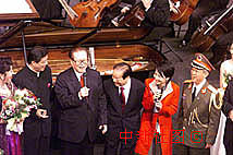 圖片:江澤民與香港歌唱家莫華倫同臺(tái)高歌(二) 2000年12月20日 16:16 江澤民主席與錢(qián)其琛、于永波以及香港歌唱家莫華倫同臺(tái)高歌。中新社傳真 滿(mǎn)會(huì)喬 攝