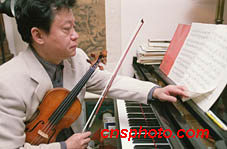 中國(guó)國(guó)家交響樂團(tuán)著名小提琴演奏家盛中國(guó),近日將開始新千年全國(guó)巡回演出。圖為盛中國(guó)在家中研究樂譜。中新社記者 張勤 攝