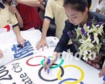 廣州中山大學、暨南大學等十所高校十八日在中山大學聯(lián)合舉行“華南萬名師生支持北京申奧巡回簽名活動首簽式,中國奧運冠軍劉璇在場簽名。中新社記者 羅仰明 攝