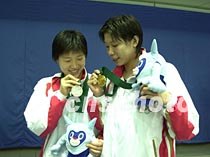 在第三屆東亞運動會女子二百米蛙泳比賽中分獲金、銀牌的齊暉和羅雪娟,在領獎臺上比誰的牌子亮。中新社記者 陶光雄 攝
