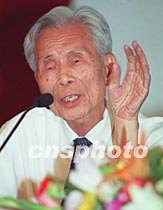 中國當(dāng)代著名畫家吳冠中一日在清華大學(xué)舉辦的“藝術(shù)與科學(xué)”國際學(xué)術(shù)研討會上,就“藝術(shù)與科學(xué)之間的關(guān)系”等問題接受新聞媒體采訪。中新社記者 張勤 攝