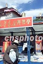 西藏拉薩大昭寺前的新華書店吸引了遠(yuǎn)道前來朝圣的藏民駐足觀看。西藏藏民的文化生活水平日漸提高。中新社記者 滿會喬 攝
