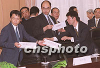 ![]() 參加中日貿(mào)易問題談判的日方人員三日下午在北京外經(jīng)貿(mào)部談判大樓參加中日貿(mào)易問題的正式磋商時(shí),臨時(shí)調(diào)整自己的坐次。中新社記者 鄒憲 攝