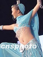 正在青島舉行的戴安娜2001世界精英模特大賽中國預(yù)選賽暨金沙灘模特大賽上,模特選手不僅要具有美妙的身材,還要多才多藝。圖為一名選手表演新疆舞。中新社記者 錢興強 攝