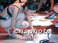 圖:模特大賽自創(chuàng)時裝 2001年08月14日 11:05 ![]() 在青島舉行的戴安娜2001世界精英模特大賽中國預選賽暨金沙灘模特大賽,日前舉行參賽選手自行設計剪裁服裝比賽。圖為參賽選手全神貫注的進行創(chuàng)意剪裁。中新社記者 錢興強 攝