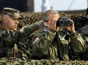 布什視察都羅山車站 稱南北鐵路是和平之路(圖) 2002年02月20日 14:41 ![]() 布什在非軍事區(qū)用望遠鏡觀望朝鮮一側(美聯社) 中新網北京2月20日消息:韓國總統(tǒng)金大中和來訪的美國總統(tǒng)布什今天視察都羅山車站。這個車站是金大中希望連接平壤和漢城的鐵路線的北終點站。 據韓國聯合新聞社報道,金大中希望借此舉來敦促朝鮮對恢復對話的呼吁作出回應。 在上午的首腦會談中,兩國總統(tǒng)就聽取了這項連接南北的鐵路工程的進度情況簡報。 在舉行聯合記者招待會后,布什乘直升飛機花費二十分鐘抵達非軍事區(qū)。這個二點五英里寬,一百五十一英里長的區(qū)域布滿地雷,分界線兩側駐扎著將近朝韓兩百萬軍隊。 美國在韓國保持有三萬七千人的駐軍。布什在抵達時向一名指揮官威廉·米勒中校敬禮致意。 布什在都羅山車站發(fā)表講話。他說:“我們今天相聚在這里,周圍是朝鮮半島和平與穩(wěn)定受到挑戰(zhàn)時的遺跡。金大中總統(tǒng)剛才向我介紹了一條他修建的道路--一條和平之路! 據路透社報道,布什敦促朝鮮對韓國開放邊境。他說:“這條鐵路可能將這塊分裂的土地兩側的人民帶到一起來。為了朝鮮半島全體人民的福祉,朝鮮應該完成它! 布什在非軍事區(qū)的講話強硬的措詞中也顯示出靈活性。他甚至在談及朝鮮時仍使用了“邪惡”這個字眼,但他同時也重申了朝鮮對話的建議。 在一個觀察哨所里,布什身穿一件手臂上繡有美國國旗的綠色軍用夾克,通過雙筒望遠鏡從壘著沙袋的地堡內觀察朝鮮一側。