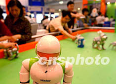 ![]() 各式各樣的機(jī)器人和機(jī)器寵物薈萃一個(gè)游戲臺(tái),為二十三日開(kāi)幕的北京國(guó)際科技產(chǎn)業(yè)博覽會(huì)助威。中新社記者 賈國(guó)榮 攝