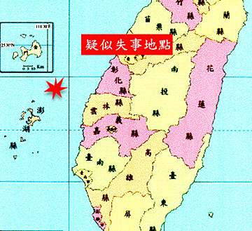 圖:臺灣墜?蜋C墜海地點示意圖 2002年05月25日 19:06 ![]() (中時電子報圖) 鄭重聲明:關于臺灣華航飛機失事的新聞信息,系中新網特稿,未經書面授權,不得采用。
