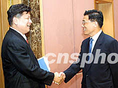 圖:傅昆萁表示希望與大陸聯(lián)手舉辦2008奧運會 2002年06月24日 19:34 ![]() 中共中央臺辦常務副主任、海協(xié)會常務副會長李炳才(右)二十四日在北京與臺灣“海峽兩岸政經(jīng)交流聯(lián)誼會三通參訪團”舉行座談。其間,傅昆萁團長表示希望與大陸聯(lián)手舉辦二00八奧運會。作者:鄭萍萍