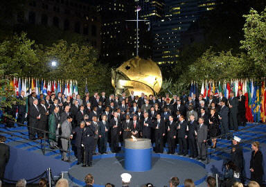 罹難者人數(shù)最多的紐約世貿(mào)廢墟是今天全美紀念活動的中心,數(shù)以萬計的人今天早晨聚集在這里聆聽每一位罹難者的名字,沿著長長的斜坡走進七層樓深的世貿(mào)廢墟中為他們獻花。當暮色降臨的時候,距離世貿(mào)廢墟不遠的炮臺公園點燃了一簇火焰,聯(lián)合國秘書長安南、美國國務(wù)卿鮑威爾、紐約市長布隆博格以及中國外長唐家璇等來自罹難者家鄉(xiāng)的代表一起舉起點燃的蠟燭,悼念死難者。與此同時,紐約的五個行政區(qū)的公園里也聚集了眾多的市民,搖曳的燭光寄托著對逝者的思念。