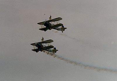 英國(guó)UBB空中雜技表演隊(duì)駕駛老式波音-斯蒂曼爾雙翼機(jī)首次作了精彩的空中雜技表演。兩架飛機(jī)密集編隊(duì),兩名女子站在飛機(jī)機(jī)翼上時(shí)而揮手,時(shí)而倒立,十分驚險(xiǎn)。