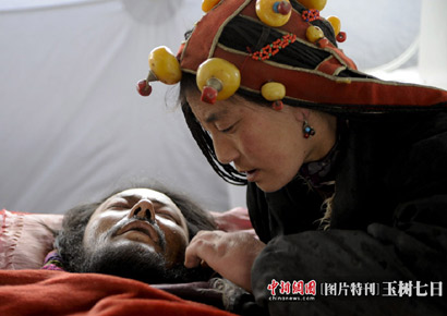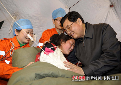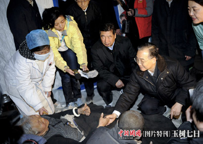 溫家寶在青海省玉樹縣玉樹自治州醫(yī)院看望受災(zāi)民眾