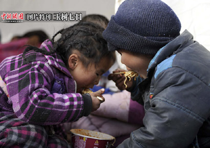 災(zāi)民安置點(diǎn)內(nèi)兩名受災(zāi)孩童分食一盒方便面