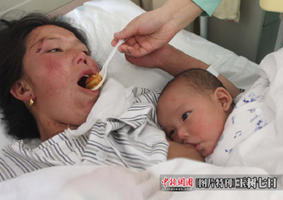 護(hù)士正在給傷員喂飯,懷中4個月大的孩子在吃奶