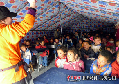 青海玉樹縣第三完全小學(xué)的帳篷學(xué)堂里學(xué)生們正在上課
