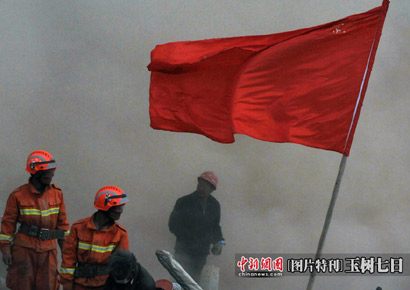 20日各地救援隊在結(jié)古鎮(zhèn)災(zāi)區(qū)煙塵中堅持抗震救災(zāi)