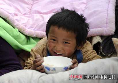 青海玉樹體育場地震民眾安置點(diǎn)一個孩子露出笑容