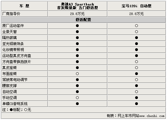在舒適配置方面,入門的寶馬120i可能會(huì)讓你失望,常見的真皮座椅以及自動(dòng)空調(diào)在這款“純運(yùn)動(dòng)”的車型身上均找不到。而相比之下奧迪A3 Sportback首發(fā)限量版就顯得更豪華了,這款新車裝配了部分奧迪原廠的“S-Line”運(yùn)動(dòng)套件,不僅視覺效果更運(yùn)動(dòng),配置也提升了一個(gè)檔次。