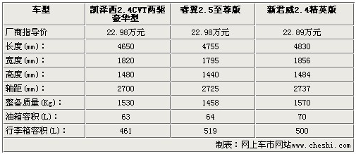 進(jìn)口鈴木凱澤西于7月2日正式上市銷售,本次上市的凱澤西共推出6款新車,售價(jià)區(qū)間18.98-27.48萬元。凱澤西是鈴木汽車旗下的旗艦運(yùn)動(dòng)型轎車,以上市后的報(bào)價(jià)來看,這個(gè)價(jià)格區(qū)間將對(duì)一些同價(jià)位的車型造成不小的影響。雖然同為20萬左右,但是純進(jìn)口車型相比國產(chǎn)車型還是有一定優(yōu)勢(shì)的。今天我們從凱澤西、馬自達(dá)6睿翼和新君威當(dāng)中挑選出三款款價(jià)格十分接近的車型,凱澤西2.4L兩驅(qū)豪華版、睿翼2.5L至尊版和新君威2.4L精英型,售價(jià)同為22.98萬左右的它們,在配置方面如何呢?接下來為您揭曉。
