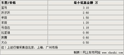 根據(jù)網(wǎng)上車市網(wǎng)站價格監(jiān)測系統(tǒng)顯示,以來自北京、上海、廣州三地城市為代表的上述8個熱銷品牌都出現(xiàn)了較大幅度的讓利優(yōu)惠。而另一方面國內(nèi)上半年的汽車生產(chǎn)量已經(jīng)超過800萬臺,國內(nèi)各大汽車交易市場和4S經(jīng)銷商處都出現(xiàn)了“庫存壓力”的報告。其中不乏BMW、沃爾沃這樣的高端品牌,而其它品牌多以大眾化品牌居多,它們當(dāng)中最小優(yōu)惠金額也在5000元以上至3.1萬元之間。