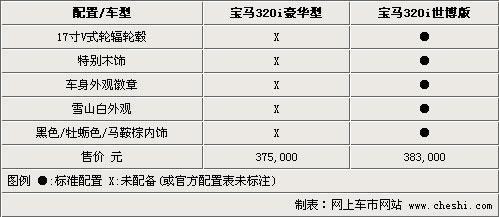 世博版320i是根據(jù)寶馬320i的豪華版衍生的,它在320i豪華版的基礎(chǔ)上增加了17寸的輪轂及輪胎、內(nèi)飾上使用了特別的棕色實(shí)木裝飾條以及白色的車身外觀色,并且在車輛尾部可以貼上一個(gè)專屬的世博徽章。售價(jià)上相比普通320i豪華版價(jià)格提升8000元,而據(jù)經(jīng)銷商方面介紹通常情況下4只同款式鋁合金輪轂的價(jià)格也在萬元左右。
