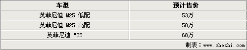 日產(chǎn)的高端品牌英菲尼迪于2007年年底正式在中國地區(qū)推出了M35車型,英菲尼迪M35無論從外觀、內(nèi)飾以及配置上都足以和寶馬5系,奧迪A6等豪華車同臺競爭。相比具有運(yùn)動風(fēng)格的英菲尼迪G37,M35是定位于商務(wù)用車,從整體的外觀和內(nèi)飾上比較沉穩(wěn)和內(nèi)斂。同時也是英菲尼迪旗下銷售比較好的一款車型。近日我們從英菲尼迪內(nèi)部人士處獲悉到,全新英菲尼迪M將于10月份引入,全新的英菲尼迪M將搭載3.7L和2.5L兩款引擎,共計3款車型(M37一款;M25兩款),預(yù)計售價53-68萬元。