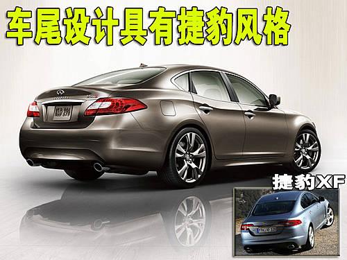 2011款英菲尼迪M在外觀設(shè)計上,吸取了在2009年日內(nèi)瓦車展上展出的Essence概念車的設(shè)計元素。帶有上下拱形線條的長方形格柵,向后拉伸的L形大燈,發(fā)動機(jī)蓋兩邊巨幅隆起的動感褶皺以及優(yōu)美流暢的腰線。新款M的車尾方面,第一印象給了我們一種強(qiáng)烈的捷豹風(fēng)格,收縮的臀部以及尾燈都讓我們想起了捷豹XK的動感車尾。