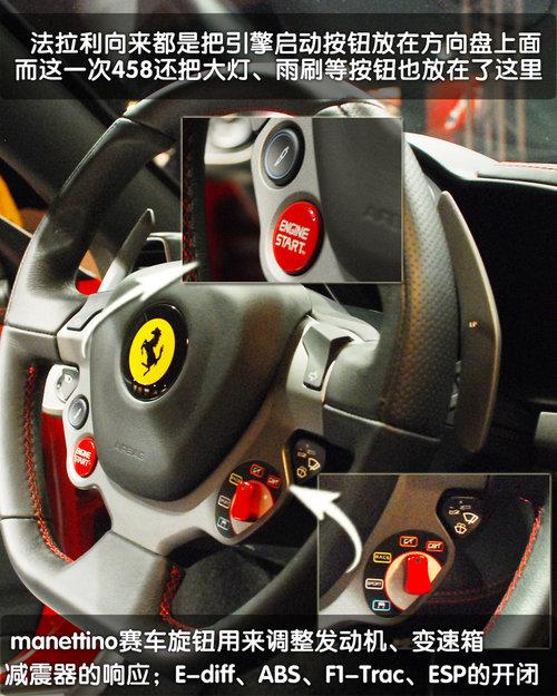 但是,法拉利的設(shè)計(jì)師最大限度的將這些功能區(qū)域進(jìn)行了劃分和設(shè)計(jì)。在方向盤的后方除了電動(dòng)調(diào)節(jié)方向盤的按鈕之外,458Italia已經(jīng)沒有任何撥桿和按鈕了,取而代之的是方向盤上面的轉(zhuǎn)向燈、雨刮開關(guān)。