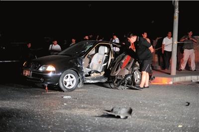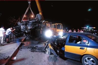 “有‘嗡嗡’的馬達聲,只看到一道黑影閃過!蹦繐粽叩耘空f,當(dāng)時酒仙橋路上一輛黑色轎車由南向北疾速行駛,“咣”地一聲悶響,迎面將一輛羚羊轎車撞得原地打轉(zhuǎn),隨后繼續(xù)前行。緊接著,不遠處再次傳來碰撞聲,一輛逆向車道上的出租車“被黑轎車頂回去三四米”。黑轎車隨即變向,撞壞橋邊護欄墜河。
