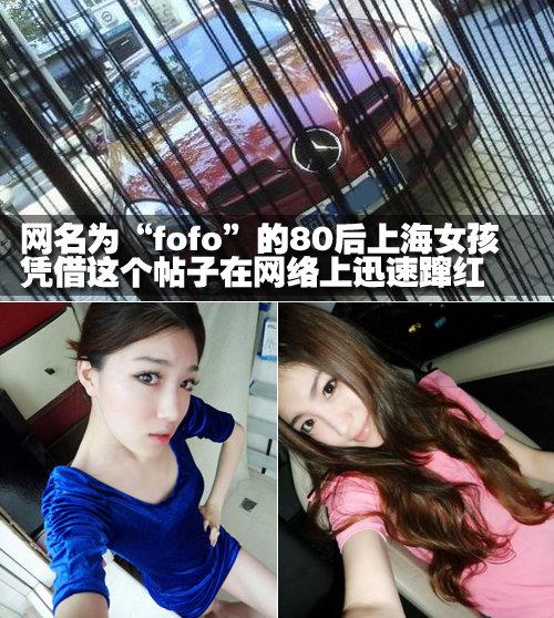 一個網(wǎng)名為“fofo”的80后上海女孩在某知名論壇中發(fā)帖《曬曬我的大奔,你們有嗎?!》,并且貼出了不少靚照,曬自己的奔馳SLK和奢靡生活。就這樣一個帖子,在短短2小時內(nèi)被蓋到100樓,點(diǎn)擊率高達(dá)了近10萬,并被很多網(wǎng)友轉(zhuǎn)載到各大論壇,成為最熱點(diǎn)的帖子。
