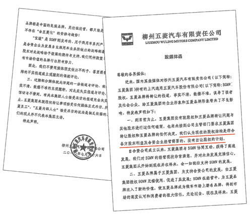 7月26日,柳州五菱汽車有限責(zé)任公司(以下簡稱五菱集團(tuán))發(fā)表致媒體公開信,明確到目前為止,五菱集團(tuán)沒有就股權(quán)和五菱品牌轉(zhuǎn)讓問題與其他股東進(jìn)行過任何磋商,也尚未接到公司主管部門要求五菱集團(tuán)轉(zhuǎn)讓股權(quán)和五菱品牌的任何決定。五菱集團(tuán)認(rèn)為,現(xiàn)在的股權(quán)結(jié)構(gòu)是符合各方股東利益及合資企業(yè)經(jīng)營需要的,沒有出讓股權(quán)的計(jì)劃……五菱集團(tuán)從開始到現(xiàn)在并在將來,會一如既往支持上汽通用五菱的發(fā)展。