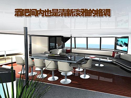 雙體船內(nèi)部的的酒吧間的中間放置的為一個(gè)較大的長(zhǎng)方形桌子,兩面相向各放置了5個(gè)吧臺(tái)椅,而較窄的一端則放置了一個(gè)吧臺(tái)椅。在這一設(shè)置的-側(cè)放置的則是舒適的長(zhǎng)沙發(fā),背后為明亮的窗戶,此外還配置了寬大的液晶顯示屏,另一側(cè)則是高高的吧臺(tái)設(shè)計(jì)。