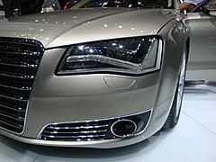 全新奧迪A8L W12 quattro在車身外觀上還有一系列的改進,包括單幅式水箱進氣格柵,其中間為鉻金屬噴涂的橫條裝飾。在其空氣通風口以及側后視鏡邊緣還擁有鉻金屬的嵌入物裝飾。其進氣格柵處及車尾還配有W12的標志,以顯示該車身份的不同。梯形的雙尾氣排放管與后保險杠完美的結合在一起。