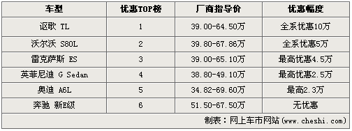 要說寶馬全新一代5系LI車型的上市撼動整個中級車市場,這樣的說法絕對不算嚴重。同級別車型都沒閑著,紛紛打出降價牌。排行榜中高居榜首的是本田的高端品牌謳歌TL車型,以全系優(yōu)惠10萬元的巨大幅度拔得頭籌;中間分列二三四五位的是沃爾沃S80L:全系優(yōu)惠5萬、雷克薩斯ES:最高優(yōu)惠4.5萬、英菲尼迪G系列:最高優(yōu)惠2.5萬、奧迪A6L最高優(yōu)惠2.3萬。唯一一款沒有降價的車型是奔馳剛剛上市才不久的國產(chǎn)新E級,全系沒有優(yōu)惠政策,購車需預定。
